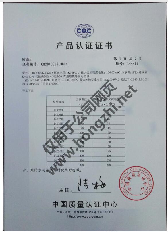 壓敏CQC-14D系列證書
